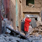 (Picture: A woman carries belongings out of a damaged building, in the aftermath of a deadly earthquake in Morocco. Credit: Hannah McKay/Reuters)