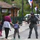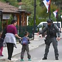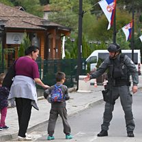 (File photo: an armed Kosovo Police officer greets a young boy while patrolling the village of Banjska in Kosovo. Credit: GEORGI LICOVSKI/EPA-EFE/REX/Shutterstock)