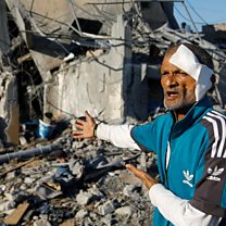 (PictureL A Palestinian inspects the site of Israeli strikes on houses in Khan Younis in the southern Gaza Strip. Credit: Ibraheem Abu Mustafa/Reuters)
