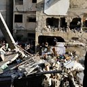 (Picture: Palestinians gather at the site of rocket strikes on a residential building in Khan Younis. Credit: Ibraheem Abu Mustafa/Reuters)