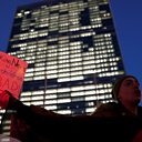 (Photo: A protester outside the UN headquarters in New York City, 8 December 2023 Credit: David Dee Delgado/Reuters)