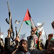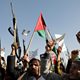 (Photo: People hold Palestinian flags during a protest against the recently announced operation to safeguard trade and to protect ships in the Red Sea, in Yemen. CREDIT: EPA/OSAMAH YAHYA)
