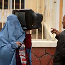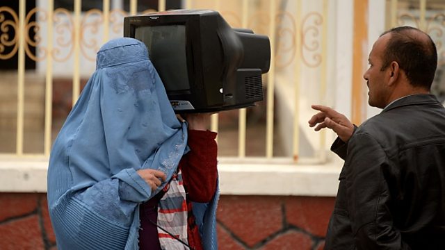 (Photo: An Afghan burqa-clad woman vendor holds a television over her shoulder. Credit: AFP)