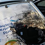 (Photo: A destroyed car of the NGO World Central Kitchen (WCK) sits along Al Rashid road, between Deir Al Balah and Khan Younis in the southern Gaza Strip, 02 April 2024. Credit: Mohammed Sabera)