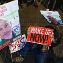 (Photo: A man sits in a cage with portraits of Israeli hostage Elad Katzir, during a protest in Tel Aviv on March 26, 2024, organised by relatives and supporters of Israeli hostages held in Gaza since the October 7 attacks by Hamas militants. Credit: Jack Guez/AFP via Getty Images)