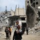 (Photo: Palestinians walk past damaged buildings in Khan Yunis on April 8. Credit: AFP via Getty Images)