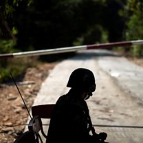 (File Photo: A Thai soldier sits in front of a road block to the Thailand-Myanmar border on December 19, 2021. Credit: Athit Perawongmetha/Reuters)