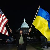 (Photo: Ukraine supporter holding American and Ukrainian flags outside Congress. Credit: Shutterstock)