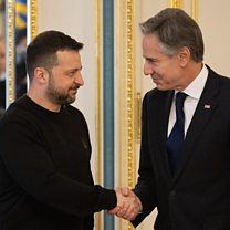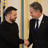 (IMAGE: Ukraine"s President Volodymyr Zelensky welcomes US Secretary of State Antony Blinken during a meeting in Kyiv, Ukraine, 14 May 2024 / CREDIT: EPA/UKRAINIAN PRESIDENTIAL PRESS SERVICE HANDOUT)