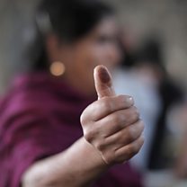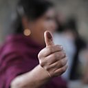 (A woman shows her inked thumb after voting at a polling station during general elections, in Comachuen, Mexico on June 2, 2024. Credit: Ivan Arias/Reuters)