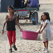 (Photo: Girls walk while carrying a container as Palestinians flee Rafah following heavy fighting, 13 June 2024. Credit: Hatem Khaled/Reuters)