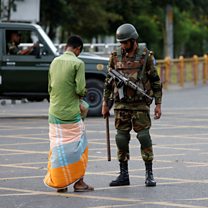 (Photo: A member of the Bangladesh Army interrogates a man who came outside during a curfew imposed in response to student-led protests against government job quotas. Credit: Reuters).
