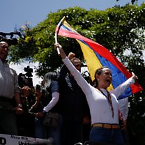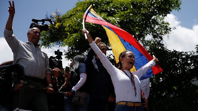 Also in the programme: there has been international condemnation after an attack in Somalia's capital Mogadishu. At least 37 people were killed on Friday in a suicide attack carried out by al-Shabab militants; and the US rock band Aerosmith have announced their immediate retirement from touring due to Steven Tyler's vocal injury. (Photo: Venezuelan opposition leader Maria Corina Machado attends a protest in Caracas. Credit: REUTERS/Leonardo Fernandez Viloria)