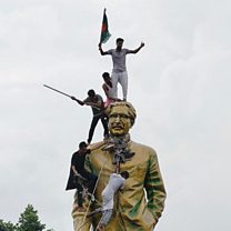 (Photo: People climb the statue of Sheikh Mujibur Rahman at the Bijoy Sarani area, as they celebrate the resignation of the Prime Minister Sheikh Hasina in Dhaka, Bangladesh, August 5, 2024. REUTERS/Mohammad Ponir Hossain TPX)