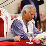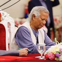(Photo: Muhammad Yunus signs the oath book as the country’s head of the interim government in Bangladesh. Credit: Reuters / Mohammad Ponir Hossain)