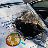 (Photo: A destroyed car of the NGO World Central Kitchen (WCK) sits along Al Rashid road, between Deir Al Balah and Khan Younis in the southern Gaza Strip, 02 April 2024. Credit: MOHAMMED SABER/EPA-EFE/REX/Shutterstock)