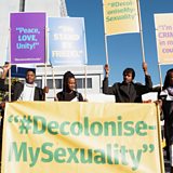 (Photo: People hold banners in support of LGBTQ rights outside the high court which made a landmark ruling in favour of LGBTQ communities in Windhoek, Namibia, June 21, 2024. Credit: REUTERS/Opas Onucheyo)