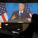 (Photo: Members of the media watch US President Joe Biden from the Media Center as he speaks at his solo press conference on the side lines of the NATO Summit in Washington, DC, USA, 11 July 2024. Credit: WILL OLIVER/EPA-EFE/REX/Shutterstock)