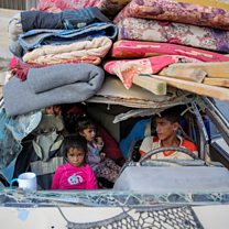 (Photo: Displaced Palestinians sit in a damaged car as they flee areas in the eastern part of Khan Younis in the southern Gaza Strip October 7, 2024. Credit: Hatem Khaled/Reuters)