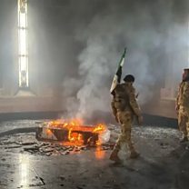 Images show the fighters standing next to the burning gravesite of Hafez al-Assad in Western Syrian Latakia province.