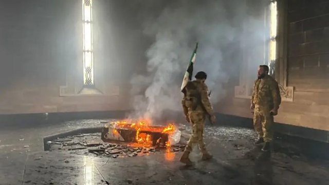 (Photo: Tomb of ousted Syrian president Bashar al-Assad's father which has been was torched in his hometown of Qardaha. Credit: Getty Images)