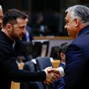 (Photo: Ukrainian President Volodymyr Zelenskiy shakes hands with Hungarian Prime Minister Viktor Orban at a European Union leaders' special summit.