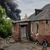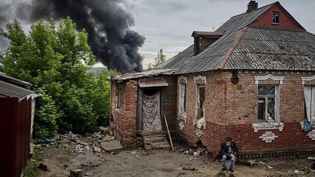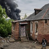 (Picture: A man sits near his damaged home as smoke rises after shelling on the outskirts of Kharkiv on May 17, 2024. Credit: SERGEY KOZLOV/EPA-EFE/REX/Shutterstock)