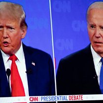 (Photo: The first presidential debate between U.S. President Joe Biden and Republican presidential candidate Donald Trump is projected on a screen during a watch party hosted by the Michigan Conservative Coalition. Credit:Emily Elconin/Reuters)