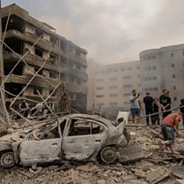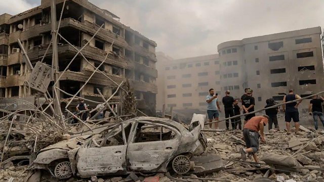 (Photo: An Israeli air strike on the Dahieh neighbourhood destroyed Dr Taghrid Diab's gynaecology clinic, in the building on the left of this picture. Credit: BBC/Joel Gunter)