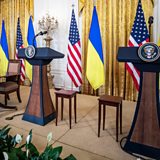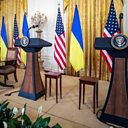 (Photo: Podiums and a table set up for an intended Trump and Zelensky press conference, Washington, 28 February 2025; Credit: