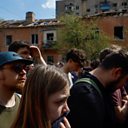 (Photo:Young people wait while rescuers search for their 17-year-old friend and his parents at the site of an apartment building hit by a Russian missile strike. Credit: Valentyn Ogirenko/Reuters)