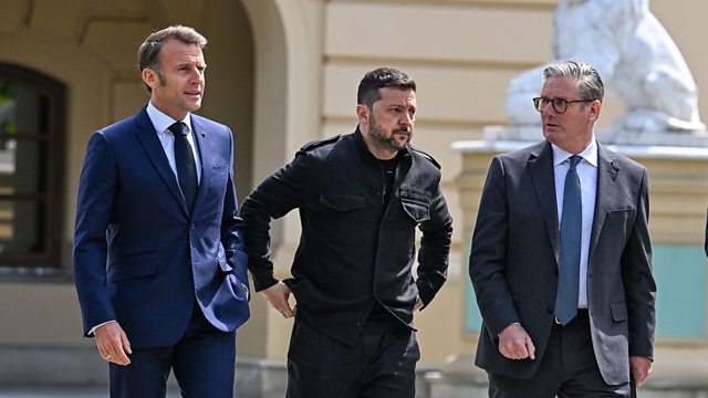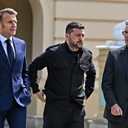 (Photo: (L-R) France's President Emmanuel Macron, Ukraine's President Volodymyr Zelensky, Britain's Prime Minister Keir Starmer walk to attend a joint press conference following a meeting of the 'Coalition of the willing' at the Mariinskyi Palace, Kyiv. Credit: Darek Delmanowicz/EPA)