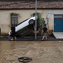 (Photo: Four men look at a car washed away by flooding in Taishitun, in the district of Miyun, Beijing, China, 29 July 2025. Credit: Andrés Martínez Casares/EPA)