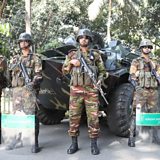 (Photo: Bangladesh security personnel stand guard in front of the International Crimes Tribunal (ICT) in Dhaka; Credit: EPA/Shutterstock)