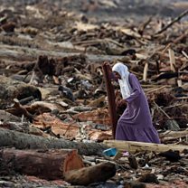 (Photo: A woman walks among tree trunks that stranded on a shore following deadly flash floods and landslides, in Padang; Credit: Reuters)