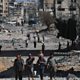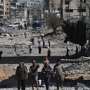(Photo: Palestinians walk along a street amid the rubble of destroyed buildings during a ceasefire; Credit: Mohammed Saber/EPA/Shutterstock)