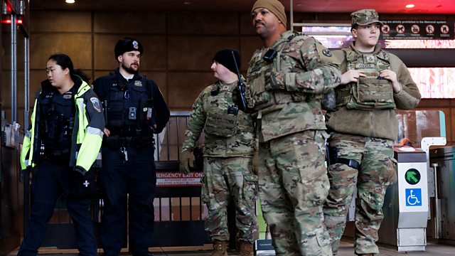 (Photo: National Guard members and police stand on deployment in northeast Washington; Credit: Will Oliver/ EPA/Shutterstock)