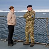 (Photo: Denmark's Prime Minister Mette Frederiksen talks with the head of the Arctic Command Soeren Andersen, aboard the Defense's inspection vessel Vaedderen in the waters around Nuuk, Greenland. Credit: Tom Little/Reuters)