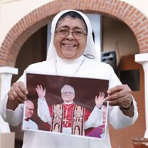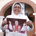 (Picture: Sister Margarita Ramos Chanduvi poses with an image of Pope Leo XIV at a convent in Lima. Credit: RENATO PAJUELO/EPA-EFE/Shutterstock)