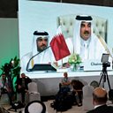 (Picture: Journalists watch on a screen as Sheikh Tamim bin Hamad Al Thani, the emir of Qatar, speaks during the opening of the emergency Arab-Islamic summit, to discuss the Israeli attack on Hamas on the Gulf country's soil, in Doha, Qatar. Credit :Reuters)