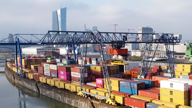 (Photo: The European Central Bank (ECB) building is seen in the background as a cargo ship is docked in Frankfurt am Main, Germany, 19 January 2026. Credit: Ronald Wittek/Shutterstock)