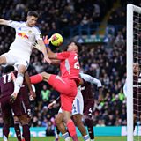 Photo: Anton Stach of Leeds United battles for possession with Emiliano Martinez of Aston Villa before Lukas Nmecha of Leeds United scores his team's first goal during the Premier League match between Leeds United and Aston Villa at Elland Road on November 23, 2025 in Leeds, England. (Credit: Getty Images)