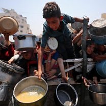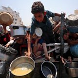 (Photo: Palestinians wait to receive food from a charity kitchen, amid a hunger crisis, in Gaza City, July 26, 2025. Reuters /Mahmoud Issa)