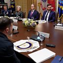 (Photo: President of Ukraine Volodymyr Zelensky (front) and US President Donald J. Trump (R) participate in a bilateral meeting in the Cabinet Room of the White House in Washington, D.C., USA, 17 October 2025.)