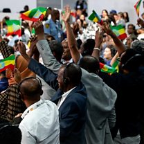 (Photo: Members of the Ethiopian delegation celebrate the announcement that the country will host COP32 during the closing COP30 plenary session at the Hangar Convention Center in Belem, Brazil, 22 November 2025. EPA/ Shutterstock)