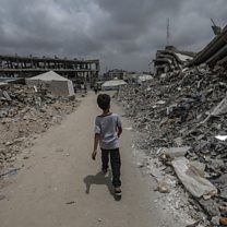 (Photo: An internally displaced Palestinian boy walks between destroyed buildings in the streets of Al Shejaeya neighbourhood in the east of Gaza City on, 12 May 2025. Credit: Photo by MOHAMMED SABER/EPA-EFE/Shutterstock)