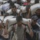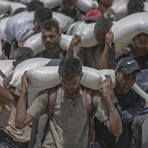 (Photo: Internally displaced Palestinians carry bags of flour near a food distribution point in Zikim, northern Gaza Strip, 27 July 2025. Credit: MOHAMMED SABER/EPA/Shutterstock)