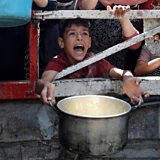 Photo: A boy waiting to receive food from a charity kitchen in Gaza City, July 28, 2025. Credit: Reuters/Khamis Al-Rifi