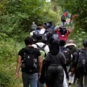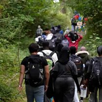 [Photo: Migrants being led through a forest by smuggler Abdullah, ahead of attempting a Channel crossing. Credit: BBC]
