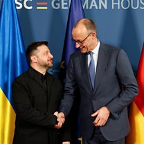 (Photo: Volodymyr Zelensky and Friedrich Merz shake hands prior bilateral talks during the 62nd Munich Security Conference (MSC), in Munich, Germany February 13, 2026 Credit: Michaela Stache/Reuters)